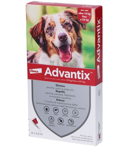 Antiparassitario per Cani da 10 a 25 kg, Eliminazione Zecche, Pulci, Zanzare - DESCRIZIONE PRODOTTO: - Advantix Spot On è un medicinale veterinario antiparassitario in pipette specificamente formulato per cani di taglia media (oltre 10 kg fino a 25 kg). Grazie alla sua azione mirata, elimina effica… ...