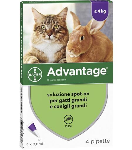 Antipulci Gatti Oltre 4 kg e Conigli Grandi - DESCRIZIONE PRODOTTO: - Bayer Advantage 80 mg Spot - On è un antiparassitario ad uso topico, specificamente formulato per il trattamento e la prevenzione delle infestazioni da pulci nei gatti superiori ai 4 kg e nei conigli di grandi dimensioni. La sua … ...