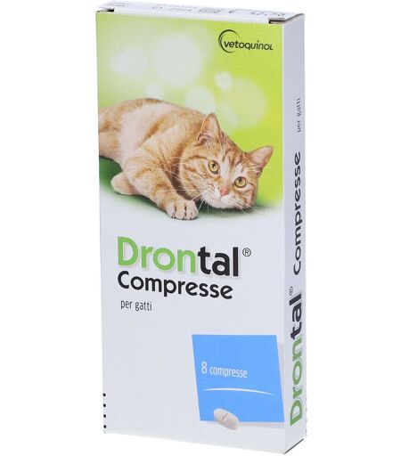 Codice Aic: 100315047Drontal Compresse Per Gatti1 compressa contiene: Praziquantel 20 mg Pirantel embonato 230 mg. INDICAZIONEPer il trattamento delle infestazioni miste del gatto da nematodi e cestodi, provocate da Ascaridi: Toxocara cati (sin. mystax), Toxascaris leonina. Anchilostomi: Ancylostoma tubaeforme, Ancylostoma braziliense . Cestodi: Echinococcus granulosus, Echinococcus multilocularis , Dipylidium caninum , Taenia spp., Mesocestoides spp., Joyeuxiella spp..CONTROINDICAZIONINon usare in animali con ipersensibilita' accertata ai principi attivi o ad uno qualsiasi degli eccipienti Drontal non deve essere impiegato durante la gravidanza. Non usare in gattini al di sotto delle 4 settimane di eta' Non usare contemporaneamente a composti a base di piperazina.PRECAUZIONI D´IMPIEGOAl fine di ottenere un efficace controllo dei parassiti il trattamento dovrebbe essere effettuato in base agli esiti dell'esame parassitologico. Precauzioni speciali per l'impiego negli animali: per assicurare un dosaggio corretto, gli animali dovrebbero essere pesati. Poiche' l'infestazione da cestodi nel gatto non compare prima della 3^a settimana di vita il trattamento con Drontal e' indicato solo dopo la 3^a settimana di vita. La resistenza di parassiti ad una particolare classe di antielmintici potrebbe svilupparsi a seguito dell'uso frequente, ripetuto di un antielmintico della stessa classe. L'echinococcosi rappresenta un pericolo per l'uomo. In caso di echinococcosi devono essere seguite specifiche linee guida per il trattamento e il follow up e per la salvaguardia delle persone. Consultare un esperto o un istituto di parassitologia. Non utilizzare in animali gravemente debilitati o con grave compromissione della funzionalita' epatica o renale. Precauzioni speciali che devono essere adottate dalla persona che somministra il medicinale veterinario agli animali: le persone con nota ipersensibilita' ai principi attivi contenuti in questo medicinale devono somministrare il prodotto con cautela. Lavare le mani dopo l'uso. Evitare il contatto con gli occhi. In caso di irritazione oculare, rivolgersi ad un medico. Non mangiare, bere o fumare mentre si utilizza il prodotto. In caso di ingestione accidentale, rivolgersi immediatamente ad un medico mostrandogli il foglietto illustrativo o l'etichetta. Sintomi di sovradosaggio non si evidenziano con dosi fino a 5 volte la dose raccomandata. Il primo sintomo atteso di intossicazione e' il vomito. Incompatibilita' non note.INTERAZIONINessuna conosciuta.AVVERTENZE SPECIALIDrontal non deve essere impiegato durante la gravidanza.EFFETTI INDESIDERATIIn casi estremamente rari possono verificarsi disturbi del tratto digestivo lievi e transitori come ipersalivazione e /o vomito e disturbi neurologici lievi e transitori come l'atassia. La frequenza delle reazioni avverse e' definita usando le seguenti convenzioni: molto comuni (piu' di 1 su 10 animali trattati manifesta reazioni avverse); comuni (piu' di 1 ma meno di 10 animali... ...