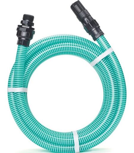 Tubo in PVC spiralato rinforzato · versione leggera con raccordo di collegamento e filtro di aspirazione · colore: verde trasparente · Intervallo di temperatura: -5 °C a +60 °C · Connessione alla pompa: dado a compressione da 25 mm (1") più adattatore per filettatura esterna da 25 mm (1") ...