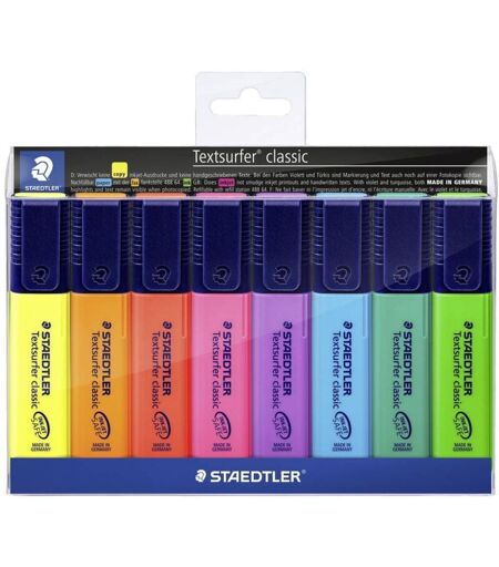 Dettagli tecnici Contenuto 8 pz. Tipo prodotto Evidenziatore Custodia per evidenziatore Textsurfer ® classic 364 con 8 pezzi, assortita Evidenziatore con grande memoria d'inchiostro per prestazioni di marcatura extra lunghe, INK·JET SAFE - non pulisce le stampe a getto d'inchiostro e i testi scritti a mano, viola e turchese per modelli da copiare, per carta, fax e kit di stampa, asciugatura rapida di pochi secondi, cappuccio girevole per una facile apertura, stelo e cappuccio in PP garantiscono una lunga durata, Airplane safe - compensazione automatica della pressione impedisce la fuoriuscita della penna in aereo, Punta a cuneo morbida in velluto ca. 1 - 5 mm, ricaricabile Testo tradotto automaticamente Punti di forza e dettagli Mina fine per carta e cartone, 12 su un unico colpo: Ricarica semplice per molti pin di carta da stampa Staedtler come ad esempio Mars micro 775 e graphite 779 ...