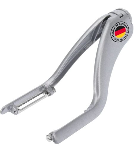 Doppio pela-verdure per pelare verdure di dimensioni affusolate come asparagi, carote, zucchine, melanzane o cetrioli, Adatto per mancini e destrorsi con mani piccole o medie - Adattamento ottimale alla forma della verdura grazie alle lame mobili, Doppiamente rapido ed economico per pelare le verdure su due lati grazie al sistema a due lame - Pelatutto speciale: Una volta presa la mano, il Peel Star pela tutto velocemente, La seconda lama bilancia la pressione sulle verdure, per es. asparagi, ed evita che si spezzi - Made in Germany, Lunga durata, Lavabile in lavastoviglie, Lavaggio a mano consigliato per preservare il filo delle lame - Contiene: 1x Westmark Doppio pelaverdure, Peel Star, Lunghezza totale: 19,2 x 5 cm, Peso: 128 g, Materiale: Alluminio rivestito/Lame in acciaio inox, 60502260. ...