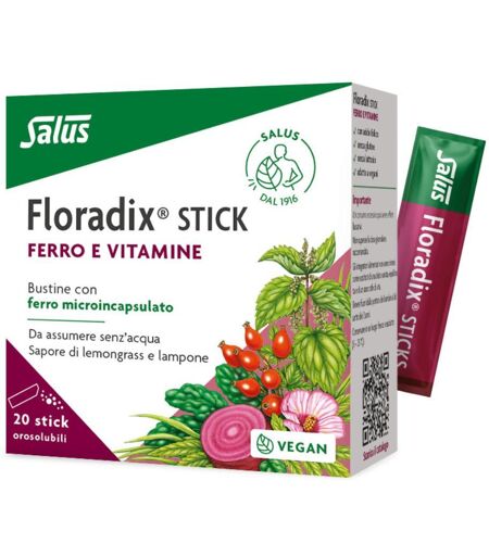 Salus Floradix Stick - Descrizione Integratore alimentare. Floradix STICK contiene ferro, vitamine B2, B6, B12, C, niacina e acido folico che contribuiscono alla riduzione della stanchezza e dell'affaticamento. Inoltre, il ferro contribuisce alla normale formazione di globuli rossi e di emoglobina.… ...