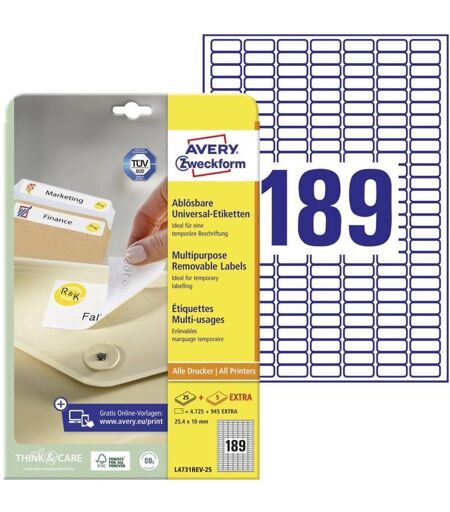 Avery Zweckform L4731REV-25 Etichetta universale 25.4 x 10 mm Carta Bianco 5760 pz. Staccabile Stampante a getto d'inch