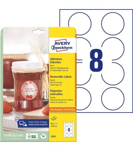 Avery Zweckform 5081 Etichetta universale ø 65 mm Carta Bianco 80 pz. Staccabile Stampante laser a colori, Stampante la