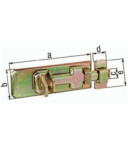 con una maniglia piatta con un cursore avanzato, i fori a vite incassati della piastra di chiusura sono coperti, in modo che lo svitamento sia impossibile · il loop è fissato da una scheda di impatto, che è coperta dal cursore avanzato · Materiale: Acciaio, Superficie: giallo galvanico zincato con anello fisso Altre caratteristiche tecniche: · Superficie: zincato giallo zincato · Misura c: 17mm · Dimensione d: 22mm · Dimensione e: 50mm · Misura a: 120mm · Dimensione w: 45mm ...