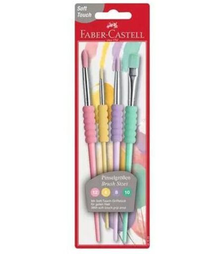 Faber-Castell 481620. Tipo di prodotto: Set di pennelli, Materiale delle setole: Sintetico, Colore del prodotto: Rosa, Viola, Verde, Giallo. Numero di prodotti inclusi: 4 pz ...