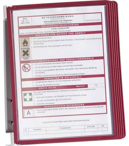 Dettagli tecnici Colore Rosso Colore del pannello espositivo Rosso Numero di display inclusi 5 adatto per formato carta DIN A4 Leggio a parete Durable VARIO WALL 5/5551-03 rosso cont. 5 pannelli Supporto a parete completo con 5 pannelli espositivi in PP SHERPA e 5 cavalierini. Montaggio a parete semplice con una vite nella parte posteriore. Significato usuale dei singoli colori usati in magazzino o nelle aree di produzione: blu -> Istruzioni operative per le macchine, rosso -> norme per la protezione antincendio o per l'evacuazione, arancione -> indicazioni di pericolo o per sostanze pericolose. Caratteristiche Colore: rosso Requisiti di sistema null ...