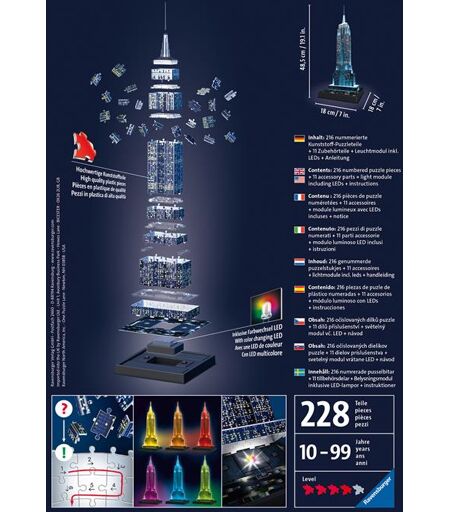 Puzzle 3D - Building Night Edition - Empire State Building - Ravensburger puzzle 3D building con LED - night special edition - 216 pezzi. Il famosissimo monumento diventa un puzzle 3D building che si illumina al buio. grazie alla luce LED posizionata sulla base, la costruzione diventa di tantissimi e bellissimi colori scintillanti. 216 pezzi + accessori. Dimensione finale: 47 x 14 x 7 cm. Puzzle 3D building ravensburger. edifici perfettamente stabili realizzati con veri pezzi di puzzle. pezzi in fibra plastica super-resistente di varie forme. si assemblano senza l'uso di colla, forbici o altri utensili, sono perfettamente stabili e rappresentano fedelmente in ogni singolo pezzo tutti i dettagli del monumento. made in germany – original ravensburger quality. All'interno supporto per ambientazione. Accessori per rendere perfetta e completa la tua costruzione. 216 pezzi di puro divertimento ravensburger. alimentazione tramite 3 pile stilo da 1,5 volt tipo aa-lr6-um3 non incluse nella confezione. ...