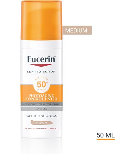 Eucerin Sun Photoaging Control Tinted SPF50+ - Crema gel solare viso antietà - Colore Medio - Descrizione Eucerin Sun Photoaging Control Tinted SPF50+ combina filtri UVA/UVB per una protezione UV molto alta e licocalcone A per la neutralizzazione dei radicali liberi indotti dai raggi UV e dalla luc… ...