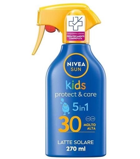 La protezione solare 5in1 protegge immediatamente la pelle dei bambini dalle scottature, previene la disidratazione cutanea e resiste all'acqua.Tipologia di pellePelle sensibile. Nivea Sun Maxi Spray Solare Kids Protect & Care FP30 ? Più protezione e divertimento per i bambini.Nivea Sun Maxi Spray Solare Kids Protect & Care FP30 è una crema solare corpo per bambini che garantisce una protezione efficace dai raggi Uva/Uvb. La sua formula con Glicerina e Vitamina E è facile da applicare e supporta la barriera protettiva naturale della pelle, che rimane idratata a lungo. La crema è inoltre adatta alle pelli sensibili, poiché riduce il rischio di allergie solari. La crema solare Nivea Sun è extra resistente all'acqua e consente ai bambini di giocare sotto al sole. Infine, rispetta la barriera corallina poiché priva di filtri UV contenenti Octinoxate e Oxybenzone.Vantaggi del prodotto:Crema solare per bambini Con FP50+ (Protezione Molto Alta)Per pelli sensibiliProtegge con i raggi Uva/UvbFormula con Glicerina e Vitamina ERiduce il rischio di allergie solariIdrata e protegge a lungo Protettiva. Corpo. ...