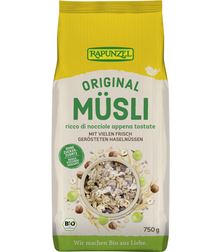Rapunzel Original Müsli 750g. Muesli Di Cereali Frutta Secca E Semi. Un Alimento Sano E Nutriente Perfetto Per La Prima Colazione. Doppia Confezione In Sacchetto Di Plastica Trasparente Ed Astuccio In Carta Riciclata. ...