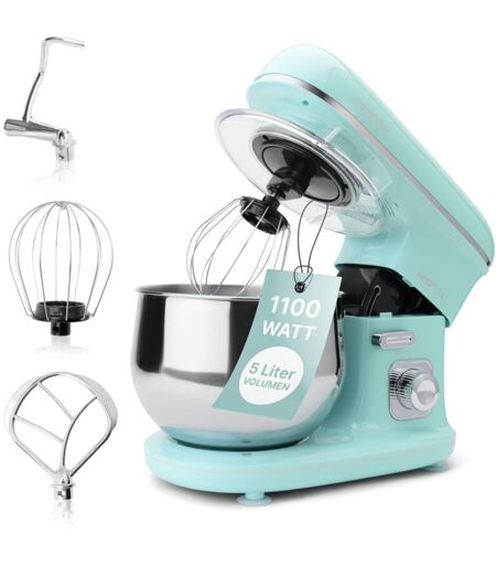 Impastatrice potente con potente 1100 Watt, regolazione elettronica della velocità senza livelli preimpostati, ciotola in acciaio inox da 5 litri per max. 2,5 – 3 kg di preparazione dell'impasto. Gancio in alluminio pressofuso. Mescolare in modo uniforme anche grandi quantità di impasto. Gancio per impastare in alluminio pressofuso, per impasti pesanti come pasta di lievito o pane, frusta in acciaio inox per biscotti sciolti e ariosi albumi. Robusto ingranaggio speciale / // Braccio multifunzione orientabile a 35°/// Meccanismo di sblocco per braccio multifunzione/// Circuito di sicurezza/// Coperchio paraspruzzi trasparente con apertura di ricarica (rimovibile) / // Funzionamento e pulizia /// Stabile grazie ai piedini a ventosa. Mandrino a sgancio rapido. Per l'attacco degli utensili. 220-240 V, 50 Hz, 1100 W ...