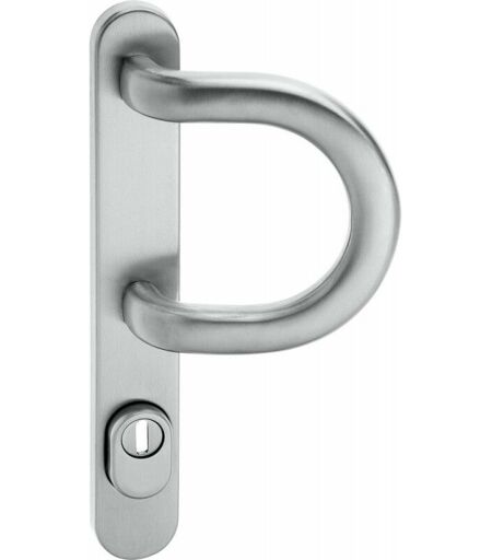 Set di cambio protezione porta profilata Kronos 2005/1045 - In acciaio inox. spazzolato opaco - Ovale - Direzione DIN sinistra-destra - Cilindro profilato forato. con coperchio. Distanza tra i fori 92 mm - Coperchio lungo della piastra posteriore. Spessore della rosetta esterna 15 mm. interna 10 mm - Cuscinetto fisso. con molla di ritorno - Pomolo a forma di manovella. Larghezza 76 mm. Altezza 58 mm - Maniglia B1 fissata sulla rosetta. Forma semicircolare curva. Larghezza 102 mm. Altezza 61 mm - Collegamento a perno. avvitato a scomparsa. con camme di supporto - Direzione di arresto della maniglia utilizzabile per destra/sinistra. Fissaggio della maniglia con perno pieno - Sottostruttura in pressofusione - Tipo di porta porte a telaio. Materiale dell'anta: alluminio. Plastica ...