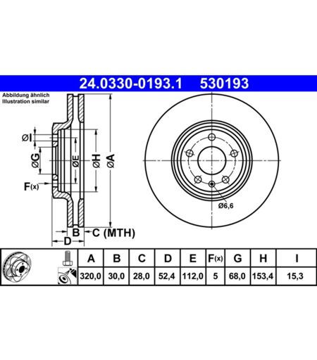 Alesaggio-ø [mm]: 15,3. Altezza [mm]: 52,4. Articolo complementare/info integrativa 2: con bulloni/viti. Cerchio foro-ø [mm]: 112,0. Diametro centraggio [mm]: 68,0. Diametro esterno [mm]: 320,0. Diametro interno [mm]: 153,4. Indice: 24.0330-0193.1. Lavorazione/trattamento: ad alto tenore di carbonio. Numero del Produttore: 24.0330-0193.1. N° fori: 5. Produttore: ATE. Spessore disco freno [mm]: 30,0. Spessore min. [mm]: 28,0. Superficie: rivestito. Tipo disco freno: ventilato. ...