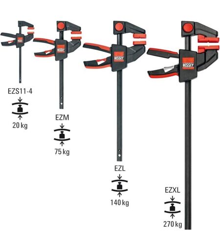Forza di serraggio fino a 2.700 N Trasformabile in distanziatore – senza utensili con EZM, EZL, EZXL grazie al semplice meccanismo di sbloccaggio premendo sulla parte superiore Impugnatura ergonomica in plastica a 2 componenti con meccanismo di pompaggio e leva di sbloccaggio integrata dietro la guida Cappucci di protezione in gomma con prisma a croce per una tenuta sicura dei pezzi tondi, appuntiti e spigolosi Comodo utilizzo con una sola mano senza sforzo Imballato SB Text Lo strettoio ad una sola mano originale BESSEY è ideale per tutti i lavori che devono essere eseguiti con una sola mano, ad esempio i lavori in posizioni scomode o le operazioni di allineamento che richiedono l’impiego di un altro utensile. Lo strettoio ad una sola mano BESSEY vi consente di fissare e tenere il pezzo con una sola mano. Inoltre potete ottenere un serraggio potente come quello offerto dai normali strettoi. Impiego diversificato La serie di morsetti a una sola mano EZ offre molte opzioni di utilizzo: ...