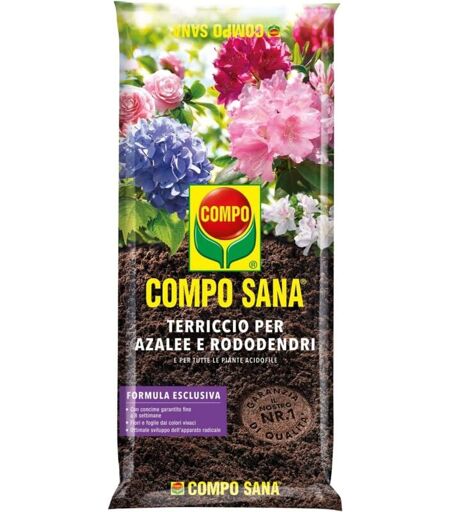 Terriccio per azalee, rododendri, ortensie, fuchsie, eriche e tutte le piante acidofile, Ottimo per la piantumazione in giardino, Torba di qualità Con concime a pronto effetto e a lenta cessione per un nutrimento equilibrato fino a 8 settimane, Favorisce la crescita di piante più sane e robuste Con attivatore radicale COMPO per radici forti che consentono un assorbimento ottimale dell'acqua e delle sostanze nutritive, Con guano per una fioritura dai colori intensi e brillanti Piante in vaso: 1) riempire il vaso con il terriccio; 2) pulire le radici e posizionare la pianta; 3) aggiungere terriccio nelle parti vuote fino a 1 cm dal bordo; 4) livellare bene e innaffiare Contenuto: 1x Sacco di COMPO SANA Terriccio per azalee e rododendri, Peso: 80 L, Art. N. 1176102005 ...