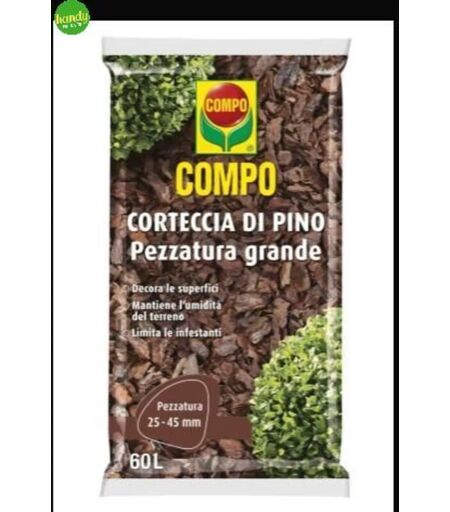 Corteccia di pino marittimo grossa, Pezzatura grande, Funzione pacciamante, Decorativo ed estetico, Vagliatura 25-45 mm Pacciamatura: limita la crescita di erbe infestanti e tiene pulite aree vicine a cespugli, arbusti, alberi e piante fiorite, Decorazione: ottimo per decorare aiuole, vialetti in giardino e fioriere Prodotto vagliato e ventilato, Consentito in agricoltura biologica, Mantiene l’umidità del terreno e favorisce la crescita di tutti i tipi di colture Modalità d’uso: 1) sarchiare il terreno e livellare la superficie 2) spargere concime e innaffiare, 3) distribuire alla base delle piante uno strato di corteccia di 5-8 cm Contenuto: 1x Sacco di COMPO Corteccia di pino marittimo grossa, Pezzatura: 25-45 mm, Peso netto: 12 kg (equivalente a 60 L), Art. N. 1836002005 ...
