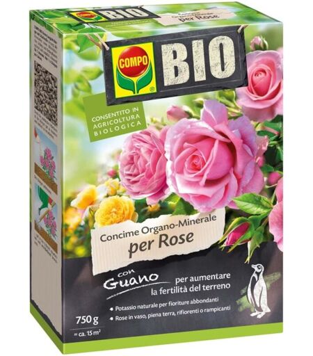 COMPO BIO Concime Rose Concime organo minerale arricchito con guano, ideale per la concimazione di tutte le tipologie di rose Con GUANO BIO per donare fertilità al terreno 100% materie prime naturali Consentite in Agricoltura BIO Pack riciclato e Riciclabile Potassio per fioriture intense e abbondanti Descrizione del prodotto COMPO BIO Concime organo-minerale per Rose è il nutrimento ideale per tutte le tipologie di rose sia in vaso che piena terra, rifiorenti e rampicanti. Costituito da un mix di componenti organiche e minerali, è arricchito di Guano per donare il giusto nutrimento e favorire fioriture prolungate e abbondanti. • Il contenuto di Azoto e Fosforo promuovono lo sviluppo sano delle piante in tutte le sue parti: rami, foglie e radici. • L’alto livello di Potassio favorisce abbondanti fioriture dai colori più brillanti. • Il Guano e le altre componenti organiche, donano fertilità e promuove l’attività dei microorganismi utili del suolo. • La presenza di Ferro e Magnesio ...