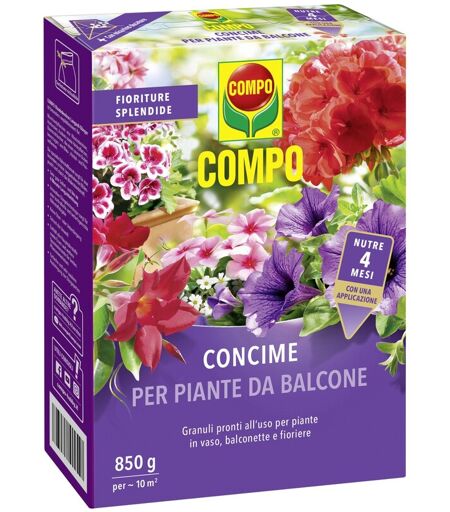 Il concime minerale Compo per piante da Balcone è il nutrimento ideale per tutte le essenze ornamentali e da fiore di vasi, balconette, vasche di balconi e terrazzi. Dotato di tecnologia a lenta cessione dell`azoto, prolunga fino a 4 mesi il suo effetto nutriente, con una sola applicazione. Modalità d`applicazione: Per messe a dimora o rinvasi, mescolare i granuli di concime con la terra di scavo o il terriccio del rinvaso. Per piante già a dimora o in vaso, distribuire il concime intorno alla base della pianta e lavorare superficialmente il terreno per interrare di alcuni centimetri i granuli. In alternativa praticare dei fori nel terreno e versare parte del concime per poi richiudere i fori con del terriccio. Dopo l`applicazione annaffia abbondantemente per permettere al granulo di sciogliersi. Rimuovere eventuali granuli caduti su foglie o fiori. Dosaggi: - in generale, 30 g per fiorierie da 30 cm in primavera - Per piante più esigenti quali geranio, petunia e surfinia, fucsia, dipladenia da 20 a 30 g per pianta - Per piante meno esigenti quali begonia, tagete, impatiens, viola 15 g per pianta - Per aiuole 100 g al mq per pianta ...