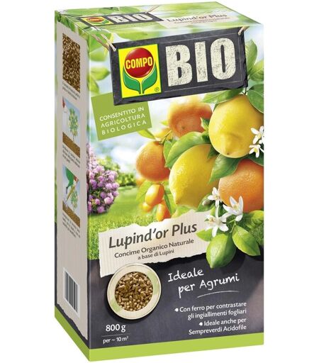 COMPO BIO Lupind`or plus è un concime organico a base di lupini arricchito di chelato di ferro e concime azotato vegetale. In grado di ricostruire le riserve di fertilità del terreno. Ideale per agrumi, un uso ripetuto migliora la fioritura e riduce la cascola dei frutti. Contrasta la stanchezza del terreno e riduce i fenomeni di clorosi grazie al ferro. Adatto anche per piante acidofile. Dose media: - 80 g per vaso - 170 g per pianta piccola in piena terra - 400 g per pianta medio/ grande in piena terra ...