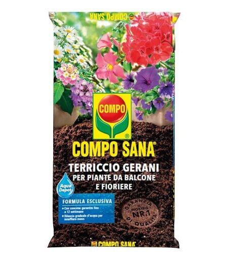 COMPO SANA Terriccio Gerani per Piante da Balcone e Fioriere Terriccio composto esclusivamente da torbe della qualita' piu' pregiata Ideale per gerani, surfinie e piante fiorite Ritentore idrico Aqua Depot per un rilascio graduale di acqua Concimazione garantita fino a 12 settimane Descrizione del prodotto Terriccio composto da torbe della qualita' piu' pregiata provenienti dal Nord Europa, ideale per gerani e piante da fiore come begonie, petunie, ciclamini, margherite, primule, surfinie, ecc. in balcone o in fioriere. Con COMPO AQUA DEPOT , l'eccellente ritentore idrico, che assorbe e conserva una parte dell'acqua somministrata durante le bagnature cedendola poi secondo le necessita' delle piante. In relazione a cio', si riduce l'evaporazione dell'acqua e, come conseguenza, il numero di innaffiature Con concime a pronto effetto e a lenta cessione per un nutrimento ancora piu' equilibrato fino a 12 settimane Piante piu' robuste e sane grazie al mix di microelementi Con fiocchi di ...