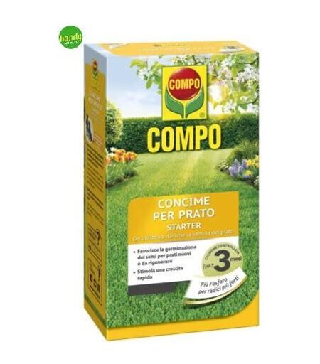 Concime NPK 17-23-8 ad alto titolo di fosforo ideale al momento della semina di nuovi tappeti erbosi o per la trasemina e rigenerazione di tappeti erbosi già esistenti. Grazie alla tecnologia a lenta cessione, l'azoto è rilasciato gradualmente nel tempo, assicurando una nutrizione prolungata fino a 3 mesi. il rilascio graduale, regolato da naturali fattori di crescita quali temperatura ed umidità, permette una crescita costante e bilanciata del tappeto erboso evitando inutili lussureggiamenti. L'elevato titolo difosforo e la presenza dello speciale attivatore radicale Agrosil® favoriscono la crescita di radici forti aumentando il successo della semina. I granuli di Compo Starter sono studiati appositamente per la concimazione deltappeto erboso. Sono infatti di forma sferica, fini e regolari per poter così penetrare al meglio tra le foglie del prato. Ogni granulo contiene i tutti i principali elementi nutritivi che vengono facilmente resi disponibiliper una crescita uniforme del prato. ...