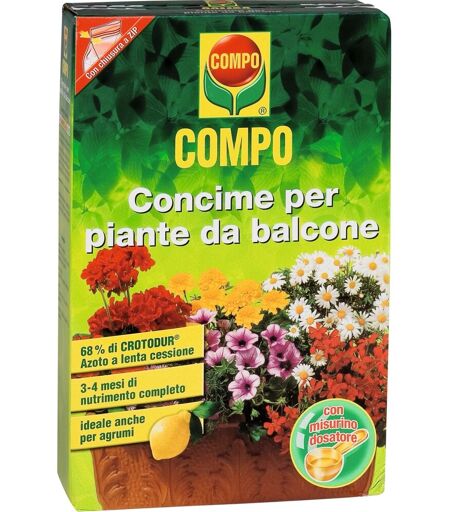 Il concime per piante da balcone Compo è un concime ad alto contenuto di azoto ad azione prolungata, CROTODUR®, di ossido di magnesio e di microelementi. Ideale per tutte le piante in vaso, da balcone e per le aiuole, assicura una crescita sana e rigogliosa, una ricca fioritura e fruttificazione, una concimazione di lunga durata (3-4 mesi). ...