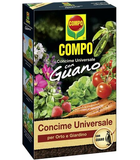 Descrizione Concime universale per orto e giardino, Arricchito con guano, prezioso fertilizzante naturale proveniente da uccelli marini - Concime organico minerale NP (Mg-S) 9-7 (3-7, 5), Per un suolo più fertile, Favorisce la fioritura e la fruttificazione - Periodo di utilizzo: tutto l'anno, Dosaggio e frequenza di utilizzo: leggere attentamente l'etichetta - Modalità d'uso: distribuire il concime sul terreno, interrare con un rastrello e annaffiare - Contenuto: 1 Confezione di Concime Universale per orto e giardino COMPO, Con guano, Con misurino dosatore, Peso: 3 kg, Art. n. 1245102511 Indicazioni Distribuire il concime sul terreno, interrare con un rastrello e annaffiare Avviso di sicurezza Tenere lontano dalla portata dei bambini e degli animali domestici. Contenuto della confezione granulato ...