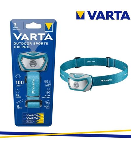Varta Lampada Frontale a LED .La Varta Outdoor Sports H10 Pro una torcia robusta con due livelli di luminosit : alto e basso .La Varta Outdoor Sports H10 Pro alimentata con 3x batterie AAA .Testa oscillante per un illuminazione ottimale dell ambiente impermeabile (IPX4), a prova di caduta fino a 2 m .Cinghia regolabile e lavabile per un comfort ottimo .La Varta Outdoor Sports H10 Pro ha una potenza luminosa fino a 100 lumen, una durata di 35 ore e una portata fino a 45 metri ...