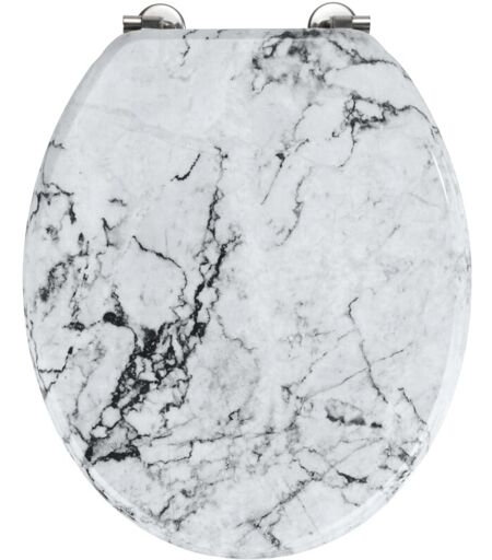 Il sedile WC Onyx, dal raffinato look effetto marmo, rappresenta un elemento di risalto in ogni stanza da bagno e toilette per gli ospiti. È comodo e confortevole. Il coperchio e l'asse hanno forma arrotondata. Il sedile, rivestito di pellicola protettiva, è realizzato con fibre di legno a media densità termopressate (MDF). Grazie alla verniciatura a più strati, la sua superficie è igienica, facile da pulire e anche resistente all 'umidità. La tenuta è garantita dal fissaggio in massiccio acciaio inox che si adatta a tutti i comuni water perché regolabile in maniera flessibile. Da abbinare all 'originale sedile WC Onyx, la WENKO offre anche il bicchiere portaspazzolini, il dispenser sapone, il portarifiuti, la tenda da doccia e il set WC. In questo modo potrete ridare alla stanza da bagno di casa vostra o alla toilette per gli ospiti un look completamente nuovo ed affascinante. Materiale: MDF, Fissaggio: Acciaio inossidabile Colore: Bianco, Fissaggio: Argento opaco Dimensioni: ...