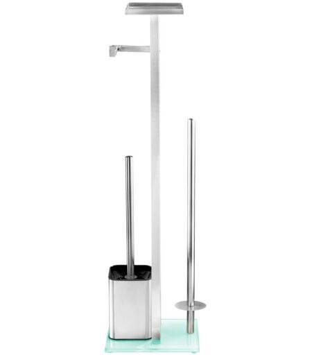 Concedete al vostro bagno un look nuovo, con la pregiata piantana portarotolo e scopino WC Debar. Grazie alle sue forme uniche e chiare, il set WC mostra sicuramente il suo lato migliore. Ma il portarotolo della serie da bagno Debar conquista non solo grazie al design armonioso dai moderni tubi quadrati. Anche il materiale in acciaio inox opacizzato risponde indubbiamente alle esigenze. È composta da un pratico abbinamento 4 in 1 comprendente un portascopino WC aperto, un portarotolo di carta igienica per un servizio immediato e un separato portarotolo per la custodia fino a 3 ulteriori rotoli di scorta. La pratica mensola offre maggiore comfort per una confezione di salviette umidificate o altri utensili, come p.e. il telefono cellulare, ecc. Naturalmente la mensola possiede un rivestimento antiscivolo. Un piedistallo quadrato in vetro di sicurezza bianco permette una sicura stabilità, grazie alle sue dimensioni perfette. In dotazione viene fornito uno scopino WC con ciuffo di ...