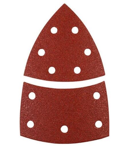 Triangoli abrasivi, LEGNO & METALLO, corindone pregiato, 100 x 62, 93 mm, con riporto di ossido di alluminio, legato con resina completamente sintetica, materiale di supporto rinforzato, con parte posteriore di velours, forato per levigatrici a delta, per levigare metallo e legno, colore, vernice, stucco, pietra e materia plastica. ...