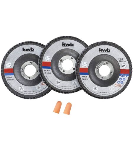 kwb 712061 3 dischi abrasivi da 115 mm in scatola con tappi per le orecchie Granulometria K-40, K-60, K-80 per smerigliatrici angolari abm. 115 x 22,23