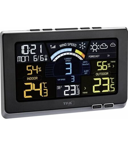 Dettagli tecnici Alimentazione del sensore Batterie 1/2 Torcia (C) (2x), da acquistare separatamente Alimentazione tensione stazione Alimentatore, incluso, Batterie Ministilo (AAA) (3x), da acquistare separatamente Colore alloggiamento (dettagli) Nero Dimensioni (sensore anemometrico) 468 x 163 x 141 mm Dimensioni (stazione di base) 208 x 26 x 140 mm Funzioni (stazioni meteorologiche) Umidità esterna, Temperatura esterna, Umidità interna, Temperatura interna, Previsione metereologica, Data, Pressione dell'aria, MAX / MIN valori, Anemometro, Orologio radiocontrollato (DCF77) Indicatore (digitale/meccanico/analogico) digitale Intervallo di misura temperatura esterna -40- +60 °C Intervallo di misura temperatura interiore 0 - 50 °C Intervallo di misura umidità aria interna 1- 99 % Intervallo di misura umidità d'aria esterna 1- 99 % Intervallo di misura velocità del vento 0 - 120 km/h Numero di sensori max. 3 Peso (anemometro) 439 g Peso (stazione) 344 g Raggio di azione Max. (campo ...