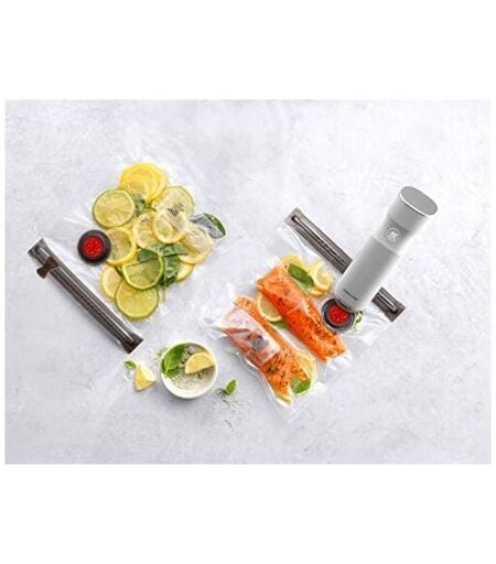 Vuoto e fresco: con l'innovativo sistema di sottovuoto Fresh & Save: Deve essere gustoso e nutriente, freschissimo e idealmente già cotto e perfettamente speziato? Nessun problema, con il concetto di freschezza Zwilling avrete sempre a portata di mano il vostro cibo preferito. Per iniziare il mondo della conservazione di aromi e vitamine, lo starter kit Fresh & Save per il sottovuoto è dotato di un'innovativa pompa per il sottovuoto, 4 sacchetti per il sottovuoto riutilizzabili e 2 scatole per il sottovuoto con coperchio. La parte centrale è la pompa, che estrae l'aria dai sacchetti e dalle scatole in pochi secondi, sigillando gli alimenti sotto vuoto. Gli alimenti, le pietanze e i piatti si conservano ermeticamente nel congelatore e nel frigorifero, così come i prodotti secchi non raffreddati nell'armadio, fino a 5 volte più freschi rispetto a quelli senza il sottovuoto. Nelle scatole di vetro, i cibi possono essere facilmente riscaldati nel microonde o nel forno (senza coperchio) e ...