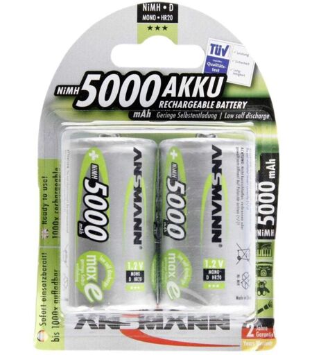Codice: 5030922 Marca: ANSMANN. Ansmann Blister 2 X Akku NiMH Mono/D 5000 mAh. Tipo batteria: D / HR20, Tecnologia batteria: Nichel-Metallo Idruro (NiMH), Voltaggio della batteria: 1,2 V ...