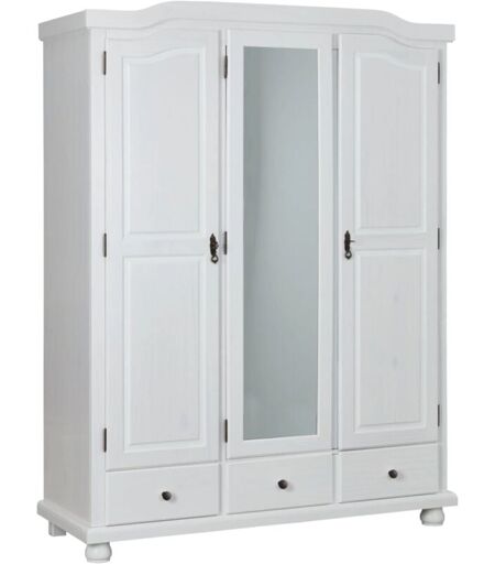 DESCRIZIONE GENERALE Armadio 3 ante e 3 cassetti in legno massiccio con finitura bianca. Design classico e capiente, dotato di anta a specchio e quattro ripiani interni per mantenere gli indumenti in ordine. Include un'ampia asta appendiabiti per abiti e pantaloni. SPECIFICHE TECNICHE Altezza: 200 cm Larghezza: 150 cm Profondità: 56 cm Materiale: Legno massiccio Numero ante: 3 Numero cassetti: 3 Ripiani: 3 Fornito in kit di montaggio ...