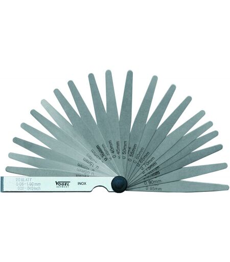 VOGEL GERMANY SPESSIMETRO IN ACCIAIO INOSSIDABILE DESCRIZIONE Lamine in acciaio inossidabile Forma conica delle lamine lunghezza 100 mm Copertura di protezione e bloccaggio a vite Indicazioni di misura in mm e in pollici su ogni lamina Mumero di lamine 20 Campo di misura: 0,05 - 1,00 mm / .002 - .040 pollici Composizione: 0,05-0,10-0,15-0,20-0,25-0,30-0,35-0,40-0,45-0,50-0,55-0,60-0,65-0,70 0,75-0,80 -0,85-0,90-0,95-1,00 mm ...