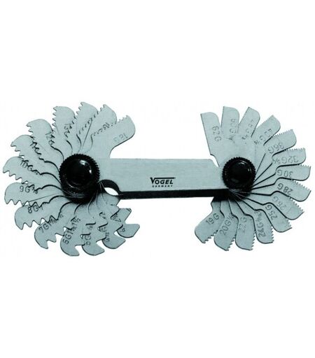 VOGEL GERMANY CONTAFILETTI 24 LAME METR. 60° DESCRIZIONE Per le misurazioni interne ed esterne delle filettature Profili finemente lavorati Numero di lame 24 Tipo di filettatura metr. 60° Passi in mm 6,0 / 5,5 / 5,0 / 4,5 / 4,0 / 3,5 / 3,0 / 2,5 / 2,0 / 1,75 / 1,5 / 1,25 Passi t.p.i. 1,0 / 0,9 / 0,8 / 0,75 / 0,7 / 0,6 / 0,5 /0.45/0.4/0.350.3/0.25 ...
