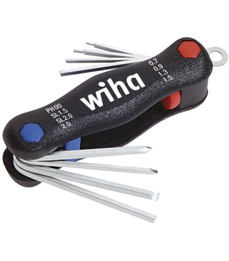 Aplicación : Especialmente indicadas para tornillos de tamaño muy reducido, para su fijación o para ajustar sensores, por ejemplo. Aplicación : Práctico soporte abatible para minillaves. Aplicación : Acero al cromo-vanadio, templado continuo, galvanizado. Extra : Arandela con mosquetón. Extra : Robusta carcasa con tecla extractora para una selección sencilla de las llaves. Mango : Carcasa ergonómica reforzada con fibra de vidrio, longitud 55 mm. Varilla : Acero al cromo-vanadio, templado continuo, galvanizado. Contenido: 1x Varilla Hexágono interior 0,7 1x Varilla Hexágono interior 0,9 1x Varilla Hexágono interior 1,3 1x Varilla Hexágono interior 1,5 1x Varilla Hexágono interior 2 1x Varilla Ranura 1,5 1x Varilla Ranura 2,0 1x Varilla Phillips PH00 ...
