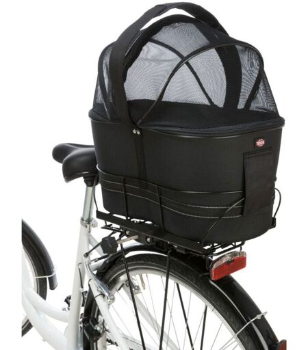 Cesto per bicicletta, per portapacchi larghi, in eva, 48×29×42cm, nero Marca: Trixie struttura in metallo robusto per un trasporto sicuro dell'animale sul portapacchi della bicicletta (larghezza 6–16 cm) può essere staccato dalla struttura grazie alle chiusure a strappo con inserto in rete con corto guinzaglio interno parti riflettenti con fondo imbottito rimovibile (fodera in peluche) in EVA per garantire una struttura stabile colore: nero in conformità all'art. 18 sul Benessere animale (normativa austriaca) ...