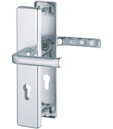 Set di pulsanti per la chiusura delle porte · con inserto parziale in acciaio come protezione di perforazione · Altezza del bordo dello scudo del pulsante: 12 mm · con avvitamento visibile a 3 volte · con camme in acciaio · Perforazione PZ · DIN sinistra / destra · Set pusher · Classe di resistenza ES 0 Altre caratteristiche tecniche: · Larghezza: 54mm · Lunghezza: 250mm · Copertura: senza coperchio del cilindro · Spessore dello scudo: 12 mm · Colore n.: F2 ...