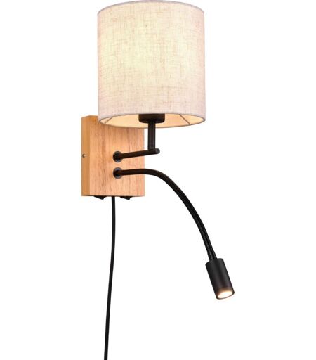 Trio-Leuchten Nilam applique base legno naturale e metallo nero con lampada lettura e paralume rotondo bianco L.18CM 2 LUCI-1 attacco E27- led 3,1W 310lm, 3000K