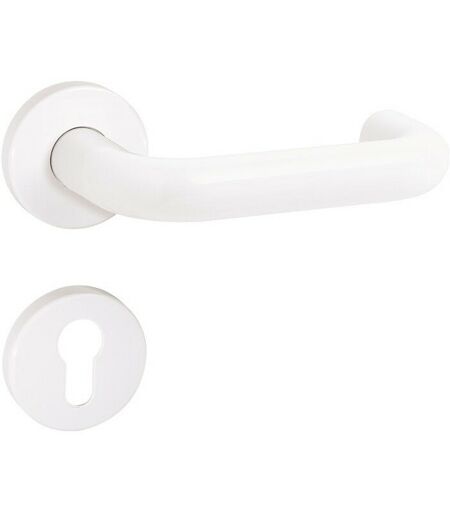 in R-technology con rosette secondo DIN 18255 e DIN EN 1906 in poliammide, superficie lucida, composta da: maniglie delle porte a forma di U in poliammide con anima in acciaio continuo fino all'estremità del pusher, costantemente colorate, diametro 23 mm, con guida di fissaggio e scanalatura di bloccaggio, assemblaggio mediante semplice aggancio delle maniglie delle porte nelle parti inferiori preassemblate sulla porta. Il detent può essere risolto di nuovo per mezzo di una chiave di smontaggio. Il pusher soddisfa i requisiti di DIN EN 179 e DIN 18040. La sottostruttura Rosette può essere utilizzata nella costruzione in composito plastico-acciaio inossidabile, DIN a sinistra e DIN a destra. Cuscinetto girevole fisso dei pulsanti con bloccaggio a tutto tondo a scatto automatico e punto cuscinetto da 5 mm come cuscinetto semplice senza manutenzione con area di compensazione elastica e seconda posizione del cuscinetto nel collo del pusher. Avvitamento nascosto e a prova di allentamento ...