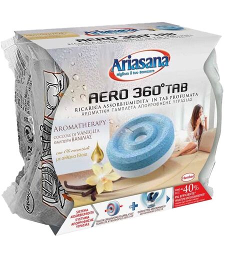 Aero 360簞 Tab previene e assorbe umidit�, muffa, condensa e neutralizza i cattivi odori grazie ad un esclusivo sistema di circolazione dell��aria a 360簞. Pastiglie di ricarica bicolore da 450 gr compatibili in apparecchi assorbiumidit� non elettrici, come Kit Aero 360簞 o altri Kit da 450g. Questa 癡 la versione Coccole alla Vaniglia. Converte l��umidit� in una soluzione salina, che viene poi raccolta nell'apposito recipiente. Non necessita di elettricit� ed 癡 quindi ecosostenibile e soprattutto conveniente. Il Kit Aero 360簞 癡 ideale soprattutto per ambienti bagno, ma pu簷 essere utilizzato anche nelle seconde case, nel seminterrato, in barca e in spazi mal isolati e con eccesso d��umidit�. Contenuto della confezione: 1x Ricariche Assorbiumidit� Aero 360簞 Tab Vaniglia ARIASANA 450 gr Aero 360° Tab previene e assorbe umidità, muffa, condensa e neutralizza i cattivi odori grazie ad un esclusivo sistema di circolazione dell’aria a 360°. Pastiglie di ricarica bicolore da 450 gr compatibili ...