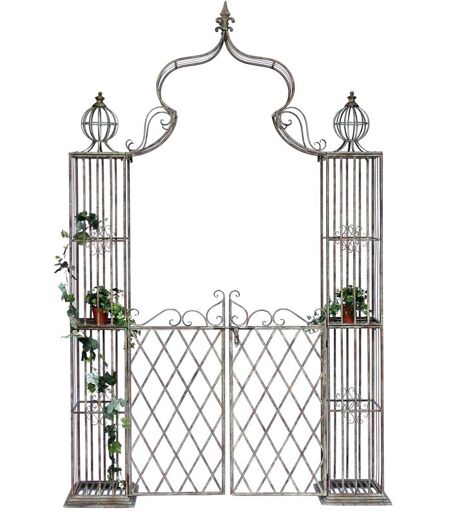 Bellissimo arco di rose con cancello, cancello da giardino. Posizionare l'arco di rose nel suo luogo preferito e lasciare che le sue piante da giardino, come rose, viti e simili, crescano verso l'alto. Con una larghezza di passaggio di 110 cm e un'altezza di 275 cm, il cancello da giardino offre un modo decorativo per abbellire il suo ingresso o il suo giardino. Utilizzi i ripiani nei pilastri per collocare ed esporre piante o fiori in vaso. Piantando sui lati, apporta ulteriore stabilità alla struttura con il peso aggiuntivo. Montaggio facile e veloce dell'arco da giardino, con fori preforati per un solido ancoraggio al terreno. Comprende 4 picchetti per il terreno (vedere Fig. 8). Gli elementi prefabbricati vengono fissati in posizione utilizzando i dadi e i bulloni in dotazione. Completamente primerizzati con vernice antiruggine e verniciati con colori di alta qualità. Materiale: Metallo, ferro battuto Colore: Verde - patina, antico Dimensioni: altezza 275 cm, larghezza 170 cm, ...