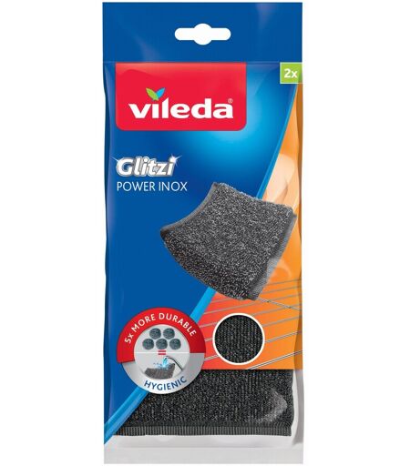 La spugna di Glitzi Power Inox di Vileda rimuove efficacemente anche lo sporco ostinato e le incrostazioni più persistenti. Grazie alla sua particolare struttura superficiale, realizzata con anelli in acciaio inossidabile, lo sporco ostinato viene rimosso anche con poca forza. Grazie alla speciale combinazione di uno strato esterno in acciaio inossidabile e di un nucleo in spugna, è particolarmente facile lavare e mantiene la sua forma. Il grado di durezza è di 3 e il materiale è composto da 36 % di filo di poliestere, 46 % di filo di acciaio e 18 % di poliuretano. La fornitura comprende 2 pezzi. ...
