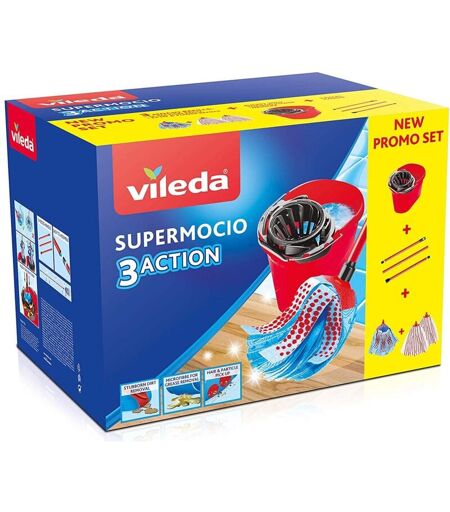 Vileda SuperMocio Box, Sistema Lavapavimenti, Set con Strizzatore, 2 Fiocchi Microfibra & Power, 1 Fiocco 3Action, Manico 3 Pezzi, Rosso -