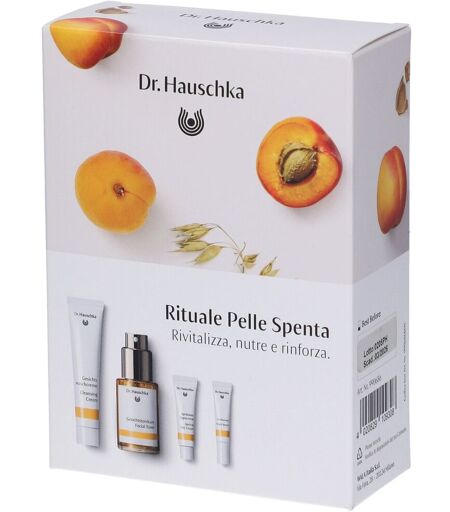 Dr Hauschka Kit Rituale Giorno & Notte Pelle Spenta Dona intensa luminosità e nutri la tua pelle con questo cofanetto viso in 3 step: il tuo trattamento completo per il giorno e per la notte in formato prova per scoprire il potere curativo delle piante officinali e tutta l'efficacia della cosmesi 100% naturale Dr. Hauschka. Il set continene: Crema detergente special size 20ml: Detergente delicato e vivificante, rispetta il naturale film idrolipidico e svolge un'azione affinante. Lozione tonificante special size 30ml: Tonico viso ad azione rinforzante e rivitalizzante. Crema all'albicocca per il giorno 5ml: Crema viso dalla texture leggera e profondamente idratante, dona luminosità e un incarnato radioso. Siero per la notte 2,5ml: Siero viso a base acquosa, azione vivificante e rigenerante. Modo d'uso: Crema detergente: la mattina e la sera, inumidire bene il viso con acqua tiepida. Procedere dunque miscelando 1-2 cm di Crema detergente con acqua sul palmo della mano, fino a ottenere una consistenza cremosa; distribuire il composto su entrambe le mani e massaggiare delicatamente il viso, dall’interno verso l’esterno, partendo dalla fronte ed evitando il contorno occhi. Inumidire nuovamente le mani e massaggiare il viso nuovamente con la Crema detergente ripetendo il rituale più volte, senza sfregare la pelle; non è un peeling. Rimuovere infine la Crema detergente con abbondante acqua tiepida e concludere la detersione sciacquando con acqua fredda. Lozione tonificante: priva di oli, la Lozione tonificante si vaporizza sul viso mattina e sera dopo la detersione, massaggiando delicatamente la pelle con le mani. Crema all'albicocca per il giorno: distribuire il prodotto uniformemente sulla pelle del viso, sul collo ed eventualmente sul décolleté la mattina dopo la detersione e la tonificazione. Siero per la notte: la sera, dopo la detersione e la tonificazione, applicare un velo di prodotto su viso, collo e décolleté. Ingredienti: Crema detergente: Aqua, Prunus Amygdalus Dulcis Seed Meal, Calendula Officinalis Flower Extract, Anthyllis Vulneraria Extract, Alcohol, Arachis Hypogaea Oil, Chamomilla Recutita Flower Extract, Hypericum Perforatum Flower/Leaf/Stem Extract, Helianthus Annuus Seed Oil, Hamamelis Virginiana Bark/Leaf Extract, Triticum Vulgare Germ Oil, Prunus Amygdalus Dulcis Oil, Parfum*, Malpighia Punicifolia Fruit Extract, Xanthan Gum, Lecithin, Algin, Rose Flower Oil/Extract, Citronellol*, Geraniol*. *from natural essential oils Lozione tonificante: Aqua, Anthyllis Vulneraria Extract, Alcohol, Hamamelis Virginiana Bark/Leaf Extract, Parfum*, Pelargonium Graveolens Flower Oil, Rose Flower Oil/Extract, Citrus Limon Peel Oil, Lavandula Oil/Extract, Cananga Odorata Oil/Extract, Linalool*, Geraniol*, Citronellol*, Limonene*, Linalyl Acetate*, Pinene*, Citral*, Terpineol*, Eugenol*, Farnesol*. *from natural essential oils Crema all'albicocca per il giorno: Aqua, Persea Gratissima Oil, Prunus Armeniaca Kernel Oil, Glycerin, Alcohol, Simmondsia... ...